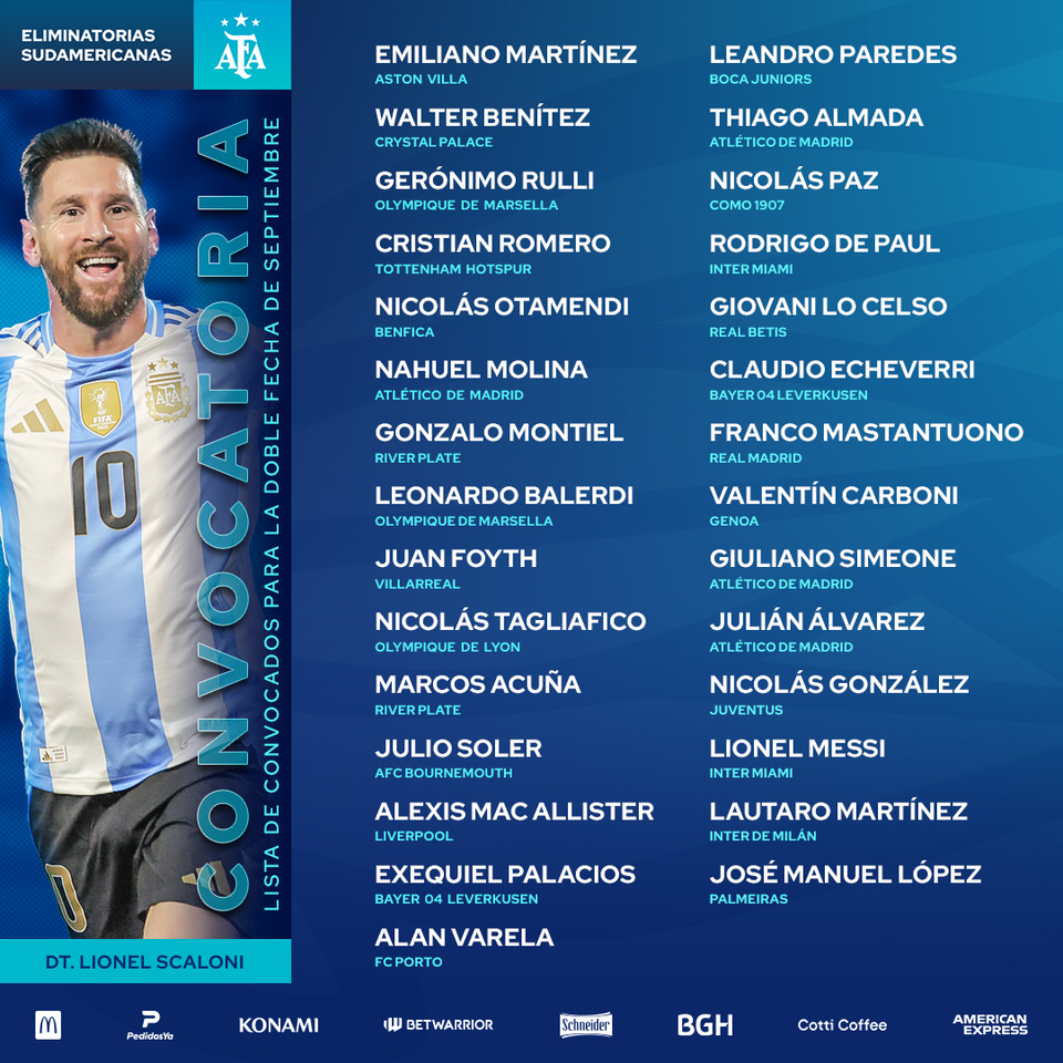 Lionel Scaloni dio a conocer la lista de convocados para la doble fecha de Eliminatorias Sudamericanas en la que la selección argentina, ya clasificada al Mundial 2026, enfrentará a Venezuela y Ecuador. Como el propio Lionel Messi anticipó, será su último partido de Eliminatorias.